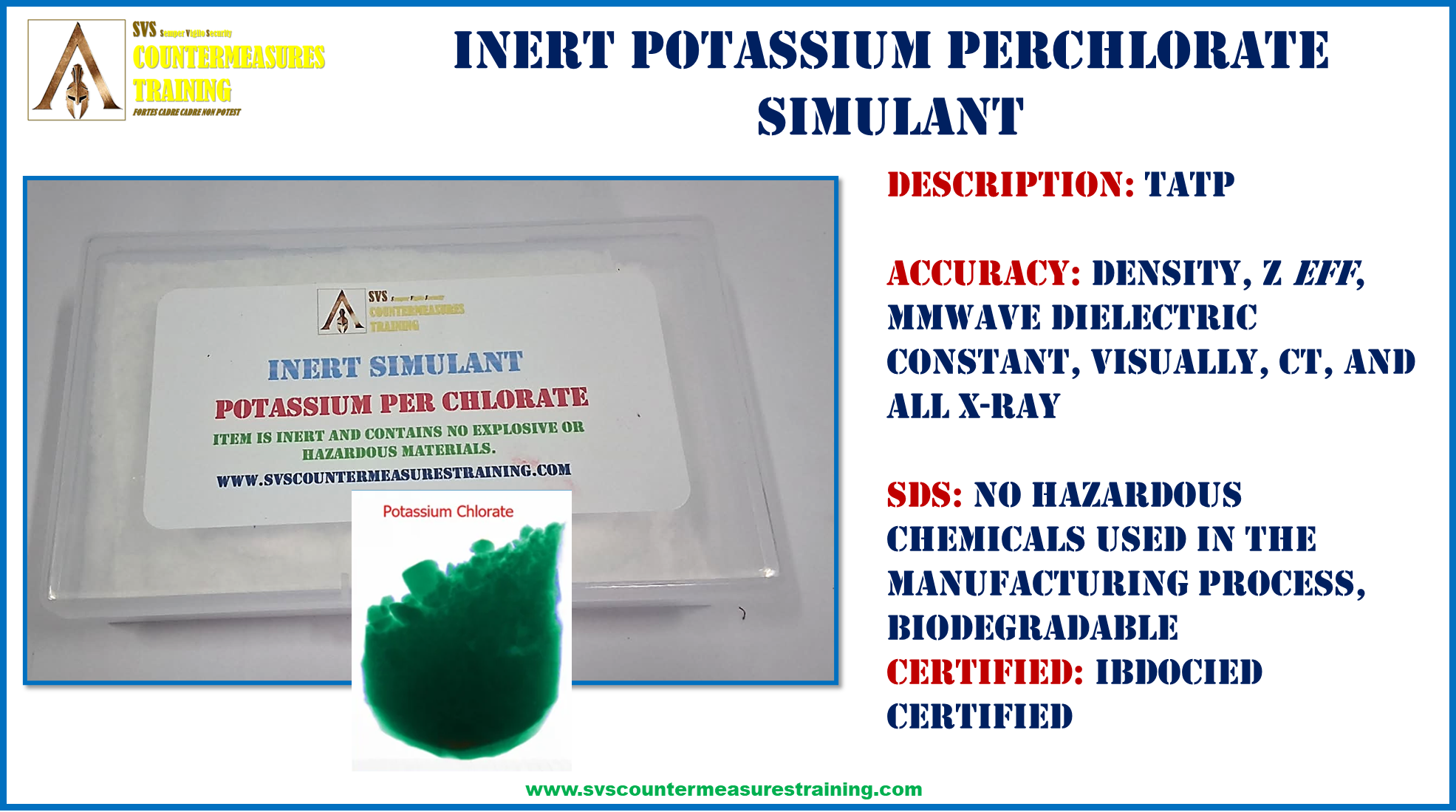 INERT Potassium Perchlorate X-Ray Accurate Explosive Simulant for EOD and Checkpoint training. High quality INERT simulant that looks and feels just like the real explosive. Will trigger cabinet x-ray auto-detection software just like the real explosive. Material has a density and Z eff that matches the ranges where explosives are located and detected by x-ray automatic detection software.