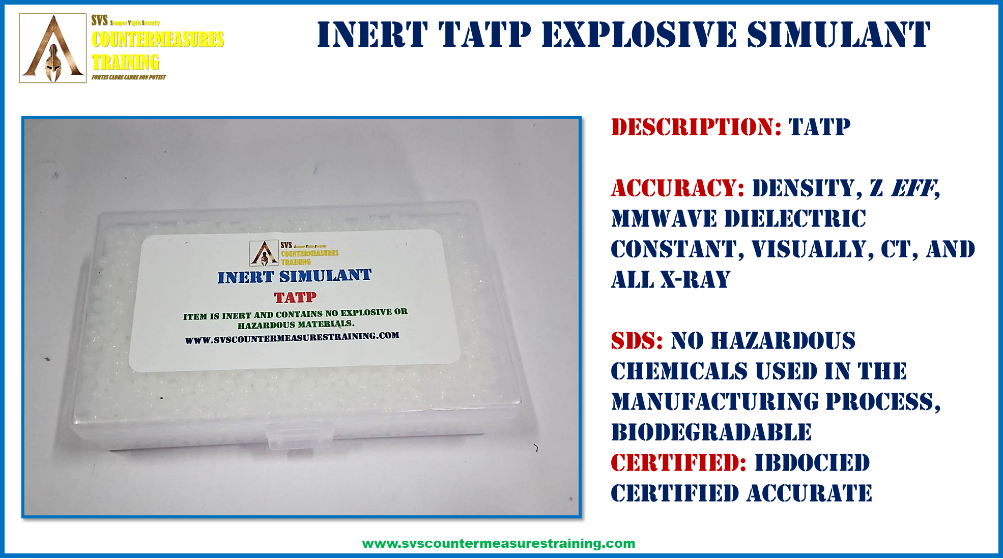 INERT TATP HME X-Ray Accurate Explosive Simulant for EOD and Checkpoint training. High quality INERT simulant that looks and feels just like the real explosive. Will trigger cabinet x-ray auto-detection software just like the real explosive. Material has a density and Z eff that matches the ranges where explosives are located and detected by x-ray automatic detection software.