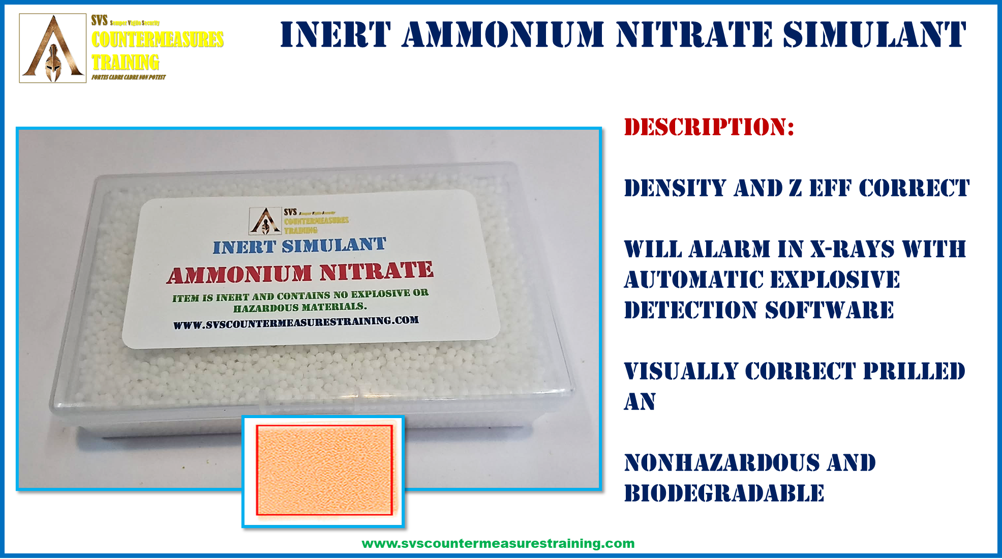 INERT Ammonium Nitrate (AN) X-Ray Accurate Explosive Simulant for EOD and Checkpoint training. High quality INERT simulant that looks and feels just like the real explosive. Will trigger cabinet x-ray auto-detection software just like the real explosive. Material has a density and Z eff that matches the ranges where explosives are located and detected by x-ray automatic detection software.