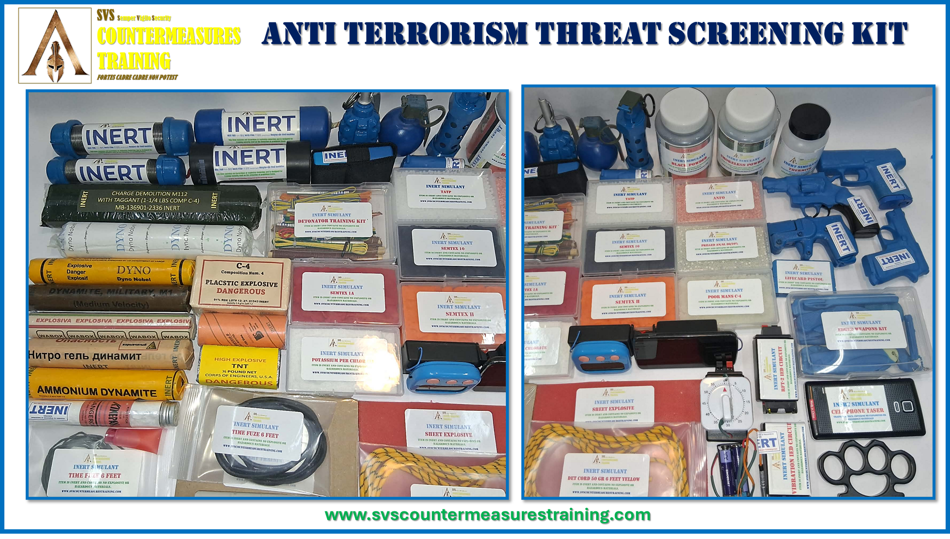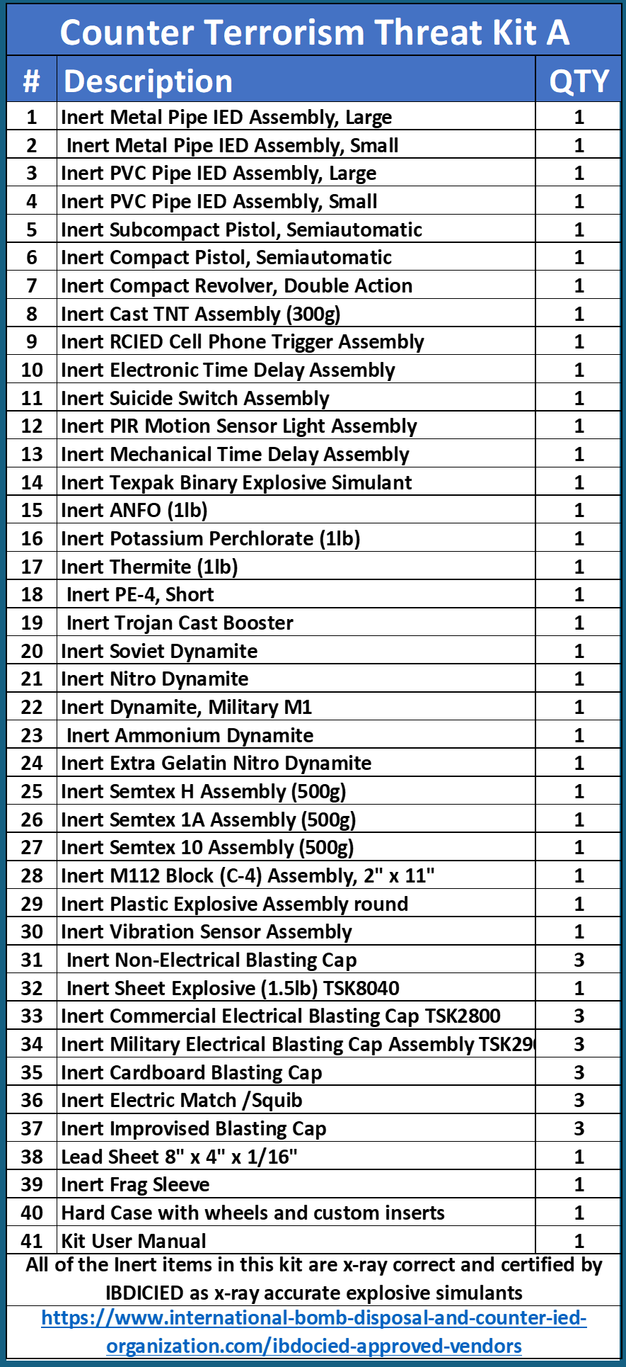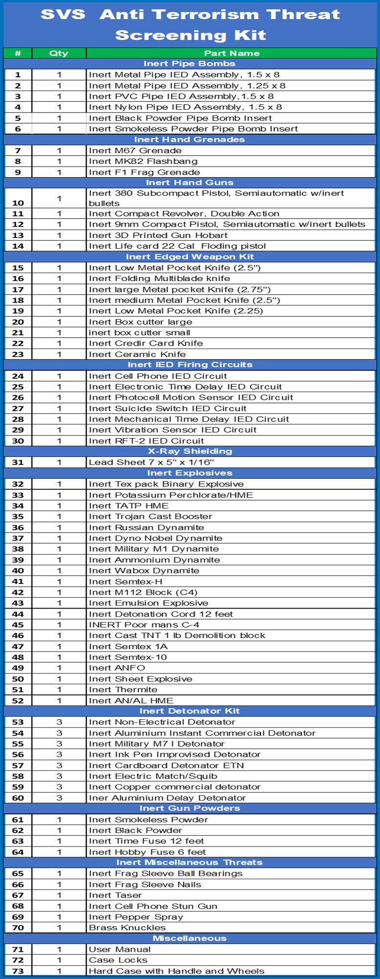 This kit is designed to train your security staff on detecting threat with x-ray, millimeter wave, walk through metal detector technologies by allow them to train with INERT realistic threats. All of the threat items in the kit are INERT but will respond in all screening technologies just like the real threats.
