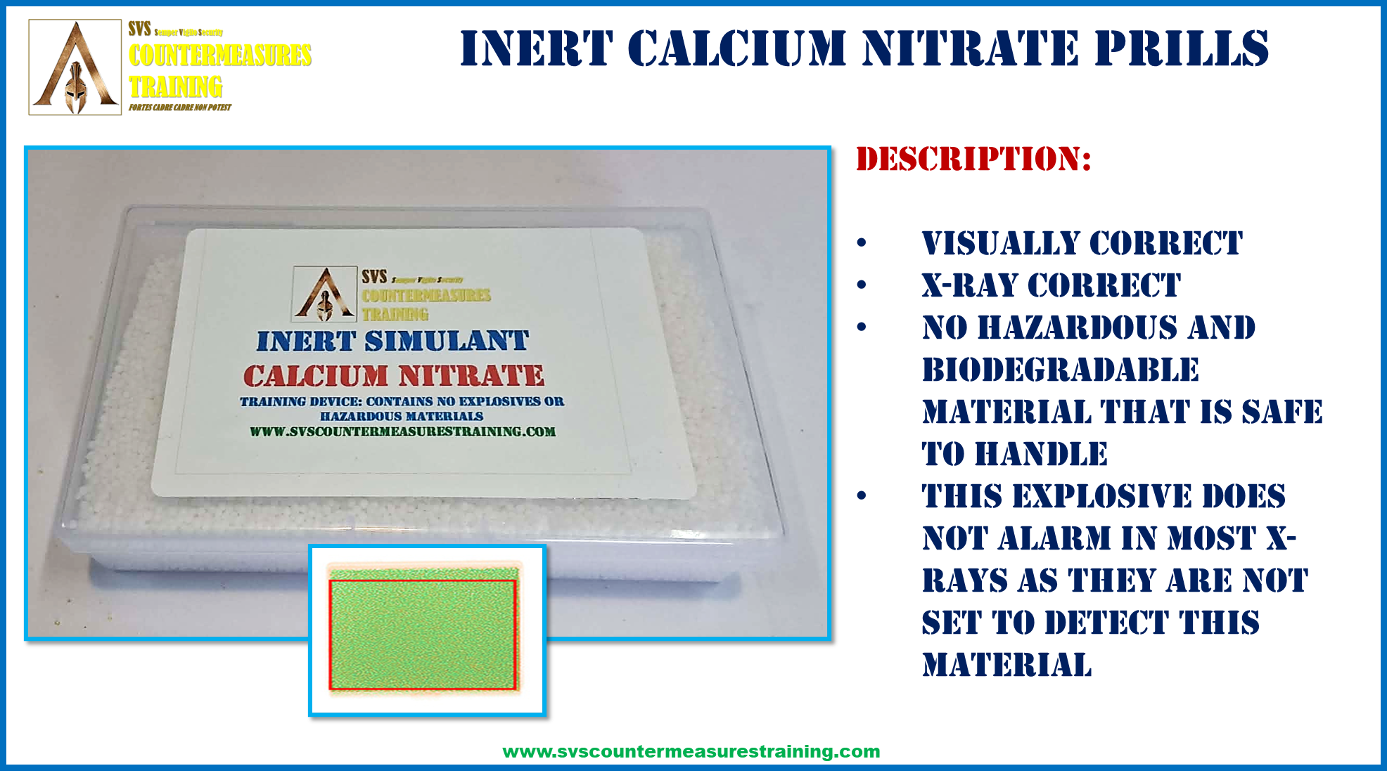 INERT Calcium Nitrate HME X-Ray Accurate Explosive Simulant for EOD and Checkpoint training. High quality INERT simulant that looks and feels just like the real explosive. Will trigger cabinet x-ray auto-detection software just like the real explosive. Material has a density and Z eff that matches the ranges where explosives are located and detected by x-ray automatic detection software.