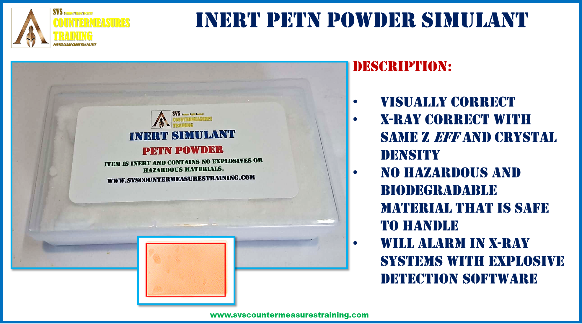 INERT PETN Powder X-Ray Accurate Explosive Simulant for EOD and Checkpoint training. High quality INERT simulant that looks and feels just like the real explosive. Will trigger cabinet x-ray auto-detection software just like the real explosive. Material has a density and Z eff that matches the ranges where explosives are located and detected by x-ray automatic detection software.